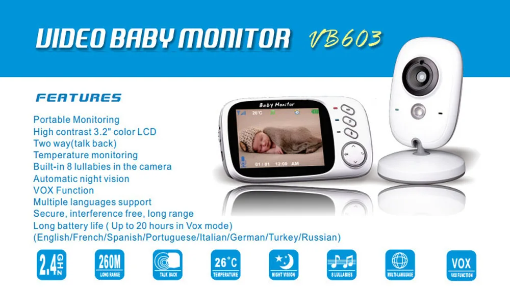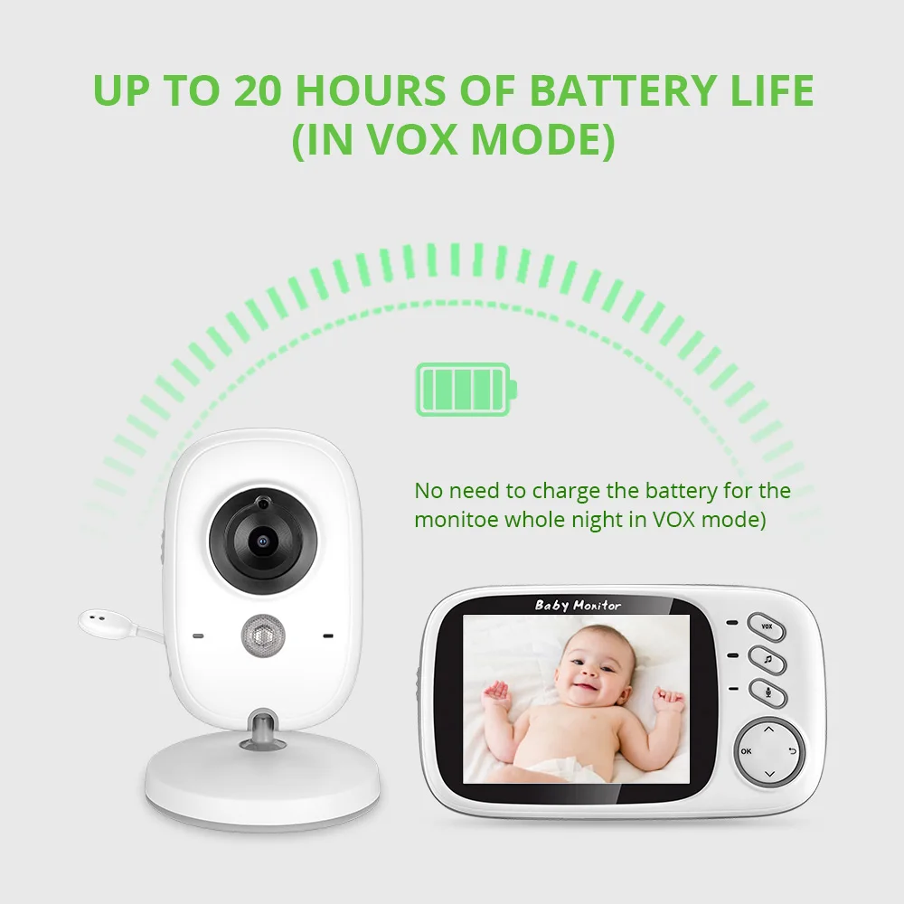 Fuers 3.2 inch Wireless Video Color Baby Monitor High Resolution Baby Nanny Security Camera Night Vision Temperature Monitoring Multilingual Support Support 8 languages (English, Français, Español, Italiano, Deutsch, Türk dili, Português, русский) Clear Two-way Audio You can talk with your baby in long distance, without running back. Automatic Night Vision Keep an eye on baby all night long with automatic night vision. Temperature Monitor This function will help you know the indoor temperature around your baby. Built-in 8 Lullabies Built-in lullabies may help the parents comfort the baby fall into sleep. UP TO 20 HOURS OF BATTERY LIFE(IN VOX MODE) No need to charge the battery for the monitoe whole night in VOX mode. Product Details Why choose our products ?