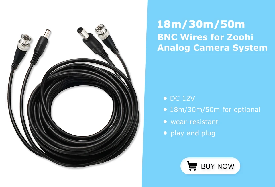 By default, each camera is equipped with a 18-meter BNC cable. If you need a longer cable, you can click here to buy a 30m or 50m BNC cable.