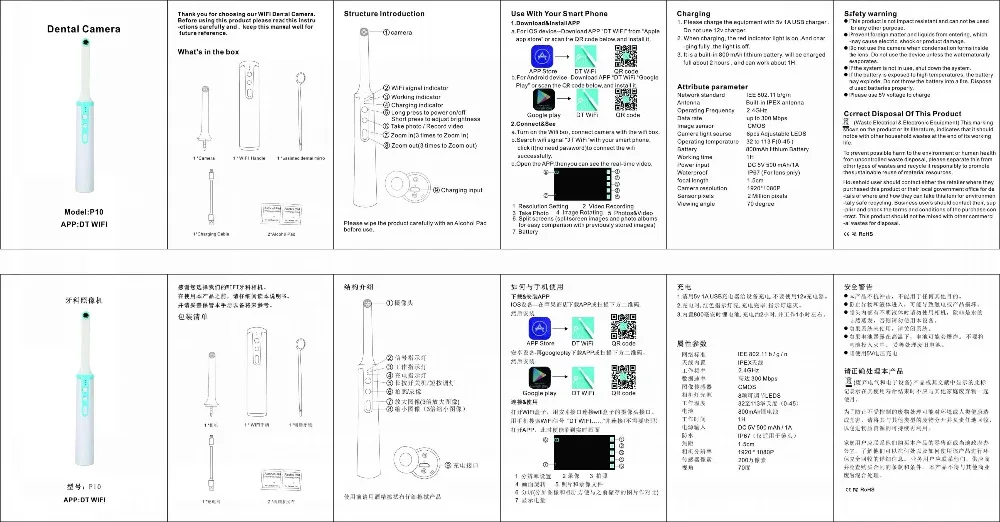Charging 1. Please charge the equipment with 5v 1A USB charger.Do not use 12v charger. 2. When charging. the red indicator light is on .And charging fully ,the light is off. 3. It is a built-in 800 mAh lithium battery, will be charged full about 2 hours , and can work about 1H. Attribute parameter Network standard: IEE 802.11 b/g/n Antenna: Built-in IPEX antenna Operating Frequency: 2.4GHz Data rate: up to 300 Mbps Image sensor: CMOS Camera light sourse: 8pcs Adjustable LEDS Operating temperature: 32 to 113 F(0-45 ) Battery: 800mAh lithium Battery Working time: 1H Power input: DC 5V 500 mAh/1A Waterproof: IP67 (For lens only) focal length: 1.5cm Camera resolution: 1920*1080P Sensor pixels: 2 Million pixels Viewing angle: 70 degree Package included: 1 x Endoscope 1 x USB Cable 1 x User Manual