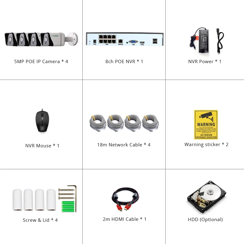 Main processor:Hi3536DOperating system:Embedded Linux20+ Languages Available: English,Russian, Italian, Portuguses, Spanish, French, German etcPreview:1/4/9Video input:8*5M /1080pAccess bandwidth:64MbpsForwarding bandwidth:36MbpsVideo compression:H.265AI/H.265+ (Compatible with H.265/H.264)Playback quality:5M/1080Phuman shape / Face:Support(depend on camera)Audio compression:G.711ARecording mode:Manual>Alarm>Dynamic Detection>TimingLocal payback :1*5M/2*1080PSearch mode:Search by Time/Calendar/Event/ChannelVideo output :1ch VGA,1ch HDMIONVIF : SupportPower supply : 52VVisit remotely by cloud or APP XMeyeH.265 Audio POE Camera Specification:
