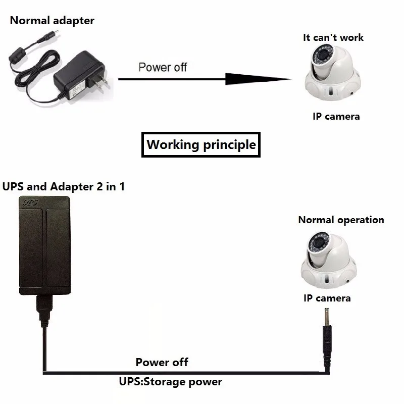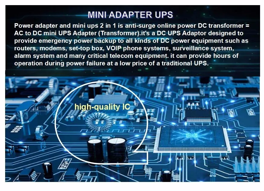 Product Concept and Application: Power adapter and mini ups 2 in 1 is anti-surge online power DC transformer = AC to DC mini UPS Adapter (Transformer).it's a DC UPS Adaptor designed to provide emergency power backup to all kinds of DC power equipment such as routers, modems, set-top box, VOIP phone systems, surveillance system, alarm system and many critical telecom equipment. it can provide hours of operation during power failure at a low price of a traditional UPS.