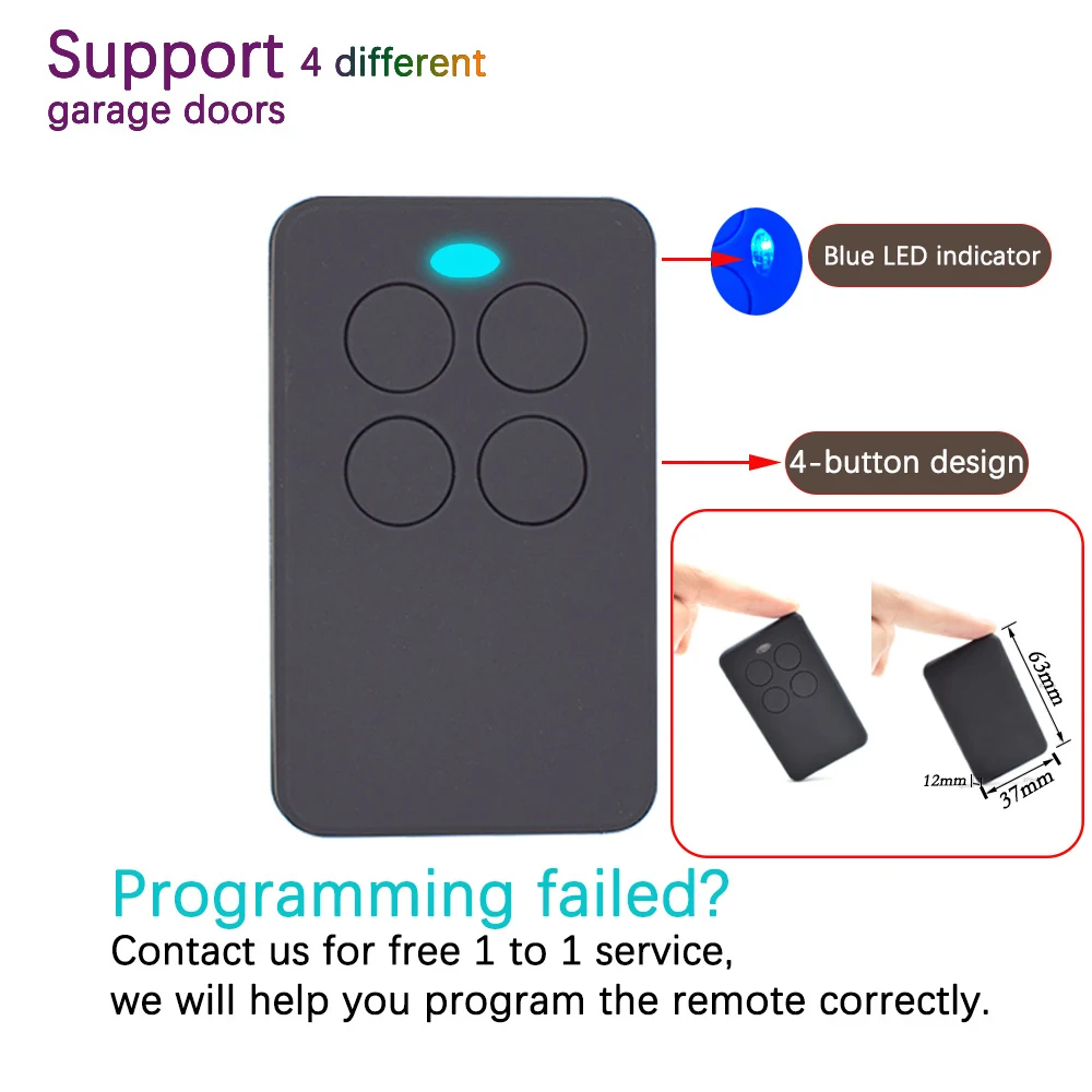 Product material: ABSProduct size: 63*37*12mmProduct weight: 30gProduct color: Black BlueRated voltage: 3VInstallation: wirelessCorresponding frequency: 280MHz to 868MHzRadio transmission distance: 30-100m (Open area)Scope of application: garage door, alarm, automatic door, rolling door, etc.Feature