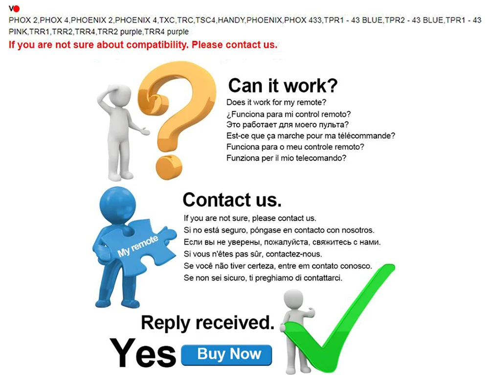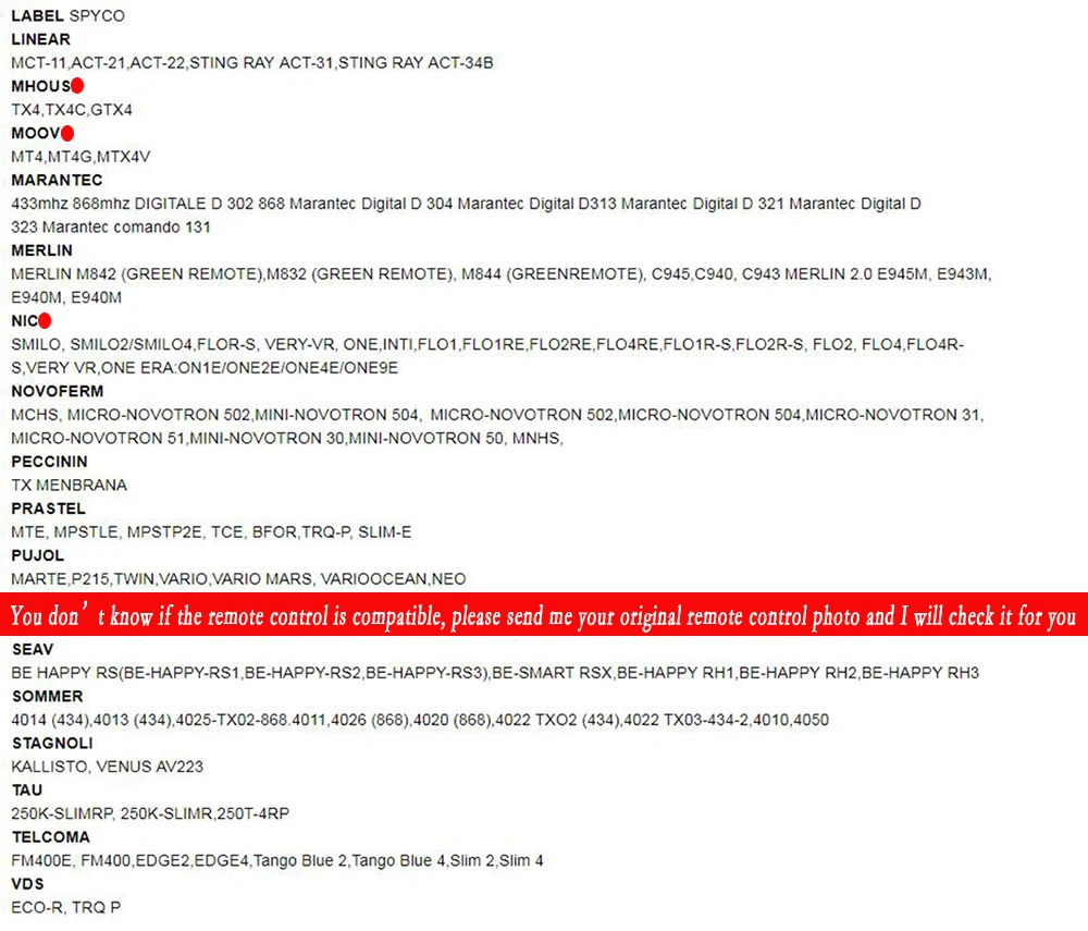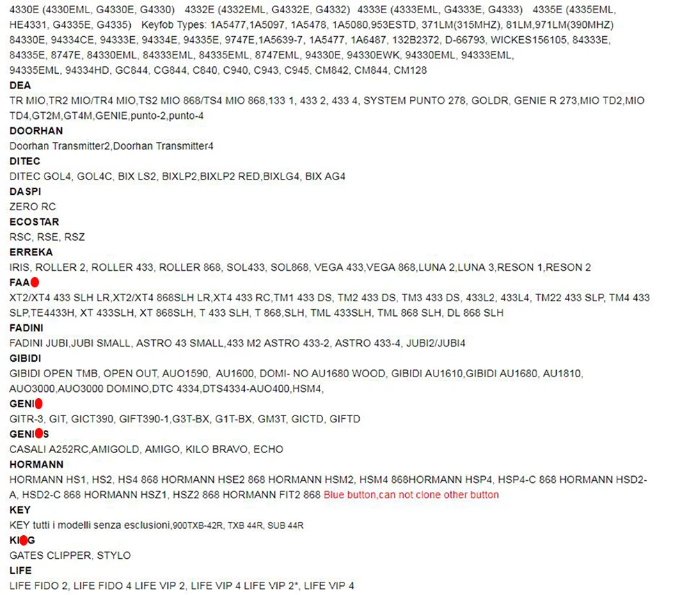 A.1 new = 4 oldsB.For Fixed code+Rolling code+Learning codeC.All of our items are brand newD.One to one key copyE.Each key password alone saveF.Can continuous repetitive copy use one million timesE.Clone in 10 seconds(After cloning the rolling code remote control, you also need to program on the receiver)Compatible with(for example)