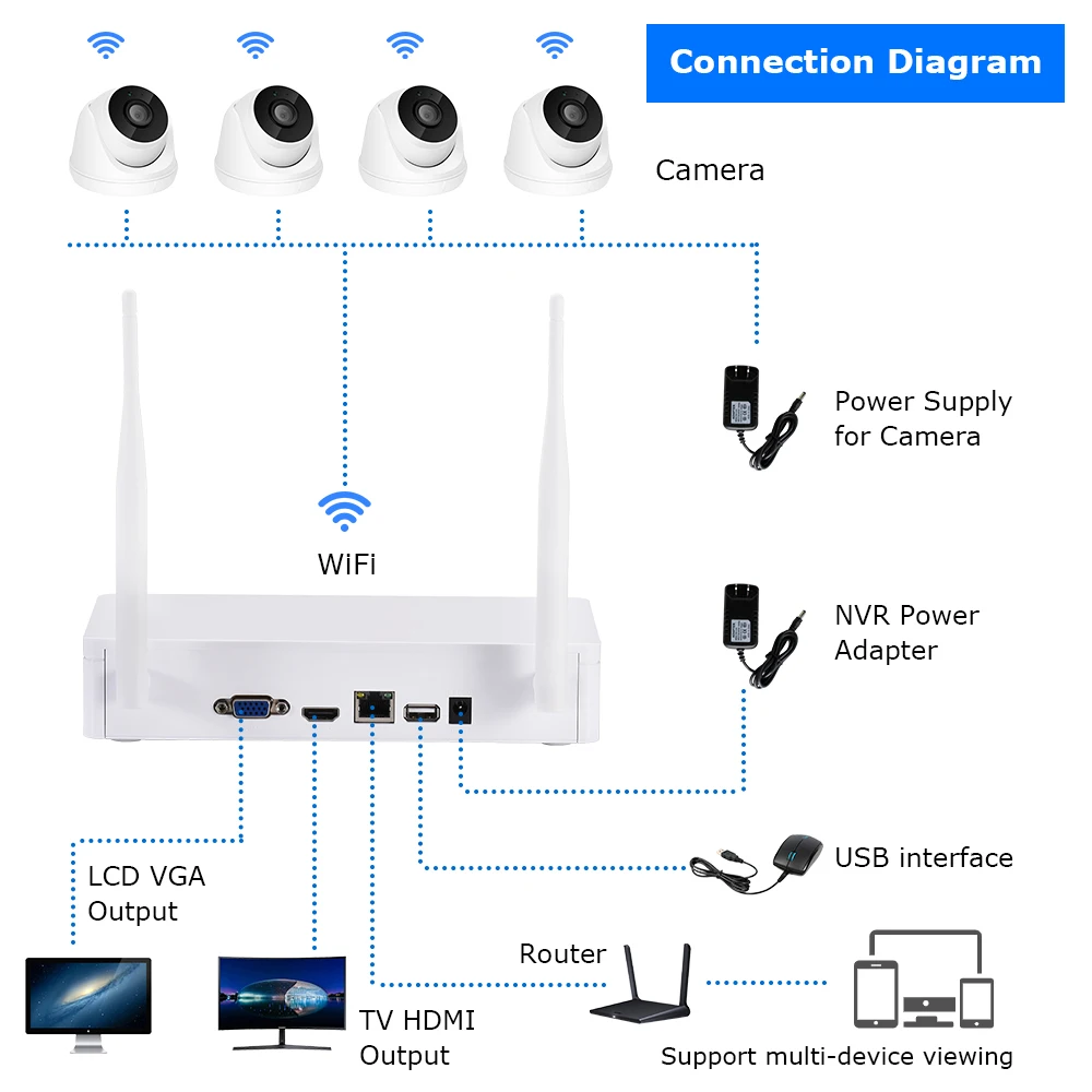 · 4/8 CH 1080P Wireless NVR· NVR Built-in Wifi Router, Bandwidth-friendly·Support Video Preview/Recording/Playback/USB Backup· Support Android/IOS/Pad/PC Remote View· Networking Protocol: UPNP, SMTP, PPPOE, DHCP etc.· Get Instant Email Alerts When Motion is detected· 1 SATA Port, Up to 4TB Each,(2.5 inch) 1 USB 2.0 Port· Power Supply: DC 12VCamera Features: