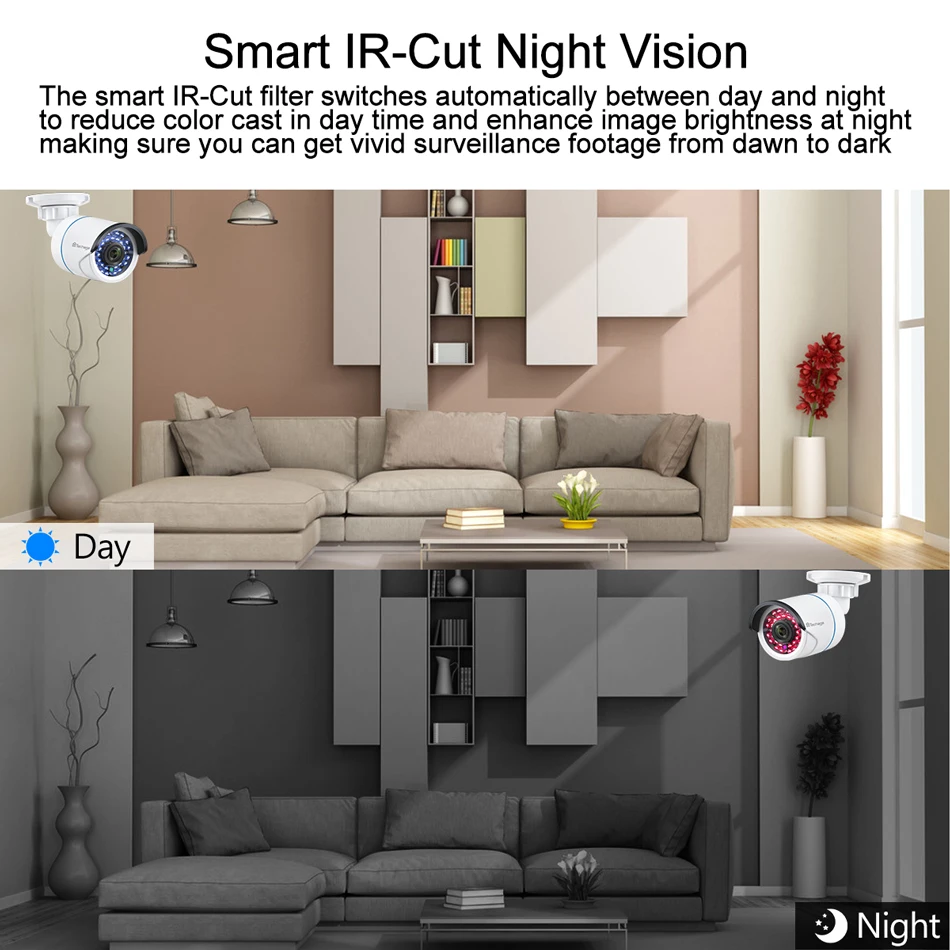 The smart IR-Cut filter switches automatically between day and night to reduce color cast in day time and enhance image brightness at night making sure you can get vivid surveillance footage from dawn to dark