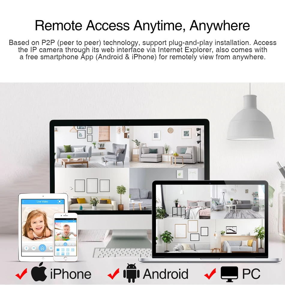 Based on P2P (peer to peer) technology, support plug-and-play installation. Access the IP camera through its web interface via Internet Explorer, also comes with a free smartphone App (Android & iPhone) for remotely view from anywhere.