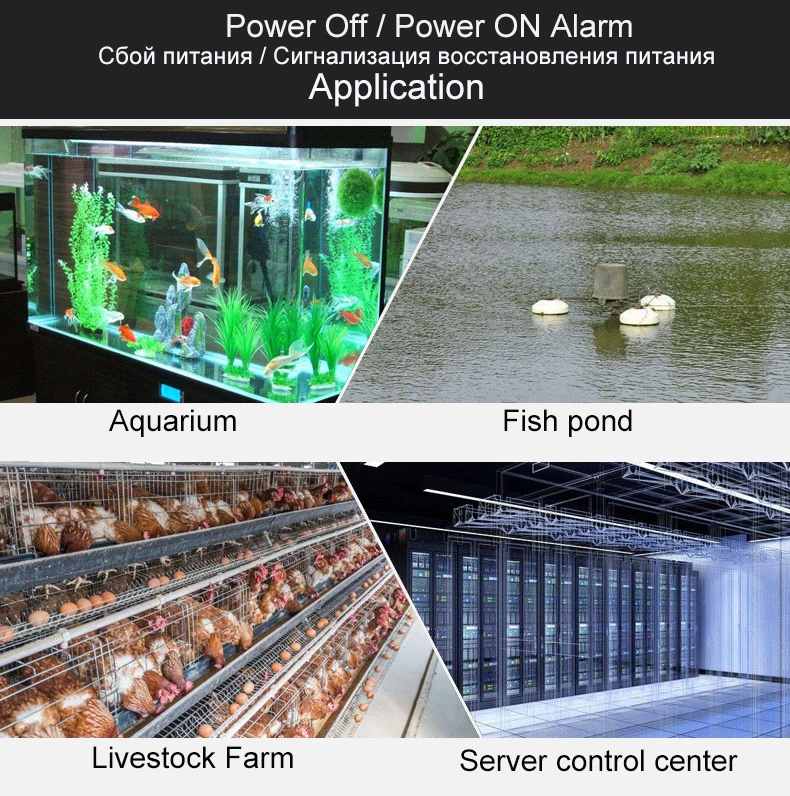 Power off and power on SMS alarm: It widely applys to aquarium, livestock farm, power equipment, bank, server monitoring center, basestation, street lamp, telecommunications equipment, 24 hour running machine etc.