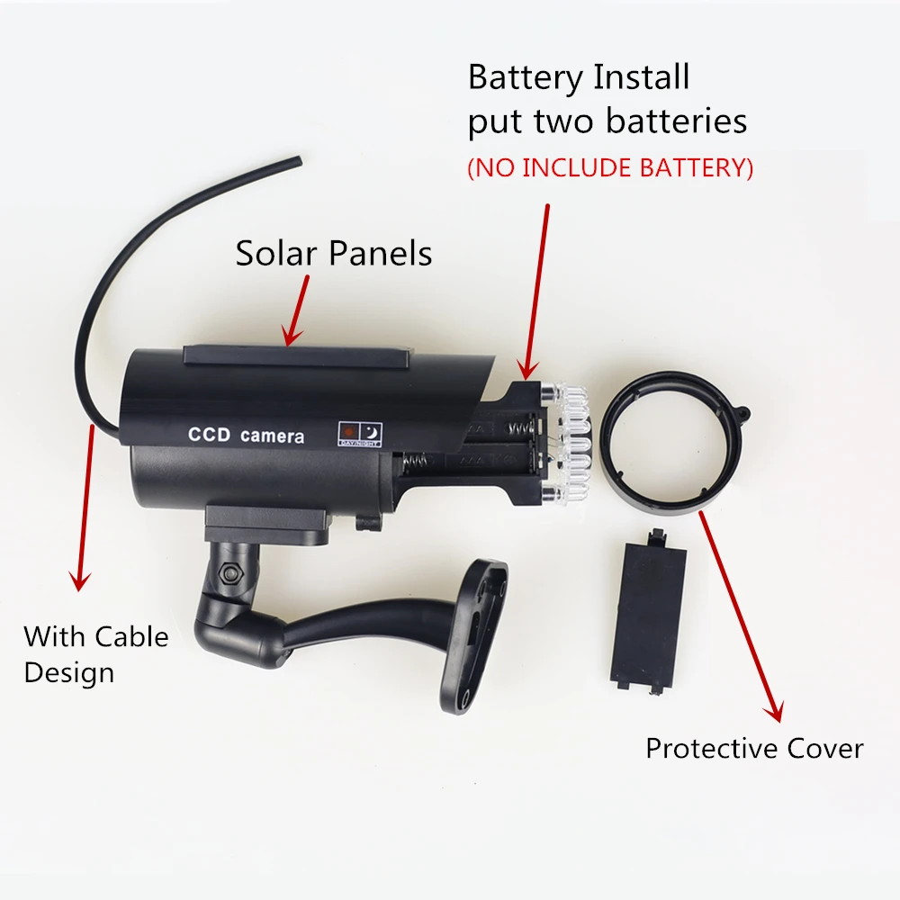 Flashing Led light & Solar Panels Real 5 Star Positive Feedback For indoor or outdoor use If you need silver color camera , please open this link : https://www.aliexpress.com/item/Solar-Power-Dummy-Camera-Security-Waterproof-Fake-Camera-Outdoor-Indoor-Bullet-LED-Light-Monitor-CCTV-Surveillance/32956024230.html Highly realistic dummy camera deters criminal behavior around your house, shops and warehouse etc. Adjustable bracket , easy and quick to install with mount bracket and screws Flashing LED red light make it appear to work as a real security camera both in day and night Powered by solar panel or 2 x AAA batteries (Battery is not included) Realistic looking dummy CCTV camera, Same size as real camera. For indoor or outdoor use. Deter theft, robbery, and vandalism from your home or business premises. Easy and quick to install, no wiring needed. Deters theft,robbery,and vandalism. Without the high cost of real security camera. NOTE:THIS IS NOT A REAL VIDEO IP CAMERA,This solar panel does not support the storage of solar energy.So when you use it at night, you need to put in the battery. Material: ABS Colour: Black Camera size: 130 * 66 * 65mm (L * W * H) Bracket arm movement: fully adjustable (0-90 tilt down, 0-360 L / R rotation) Camera activation: continuous Power supply: by solar panel or 2 x AAA batteries Battery life: Normally 3-6 month 100% new high quality For indoor or outdoor use Prevent theft, robbery and sabotage from your home or business premises Wall mounts and fixtures Easy to install, no wiring required The flashing LED and realistic wiring make it look like a real security camera A high degree of professional imitation makes it easy to confuse with a real came