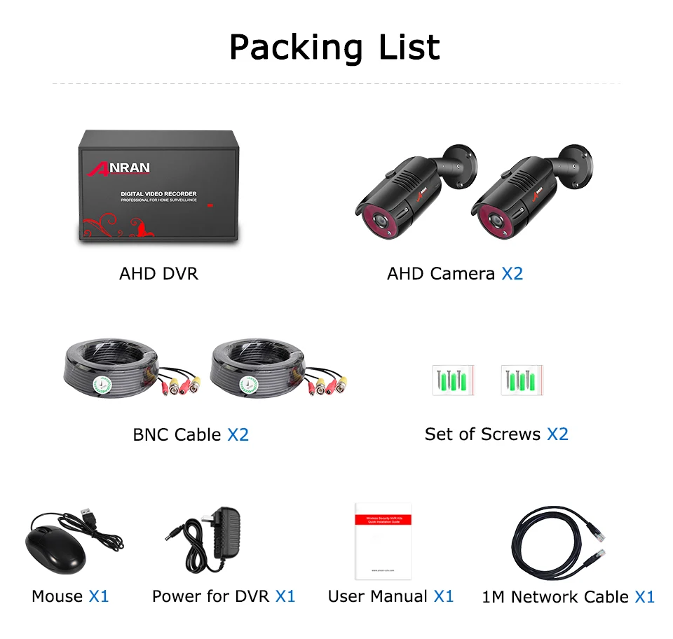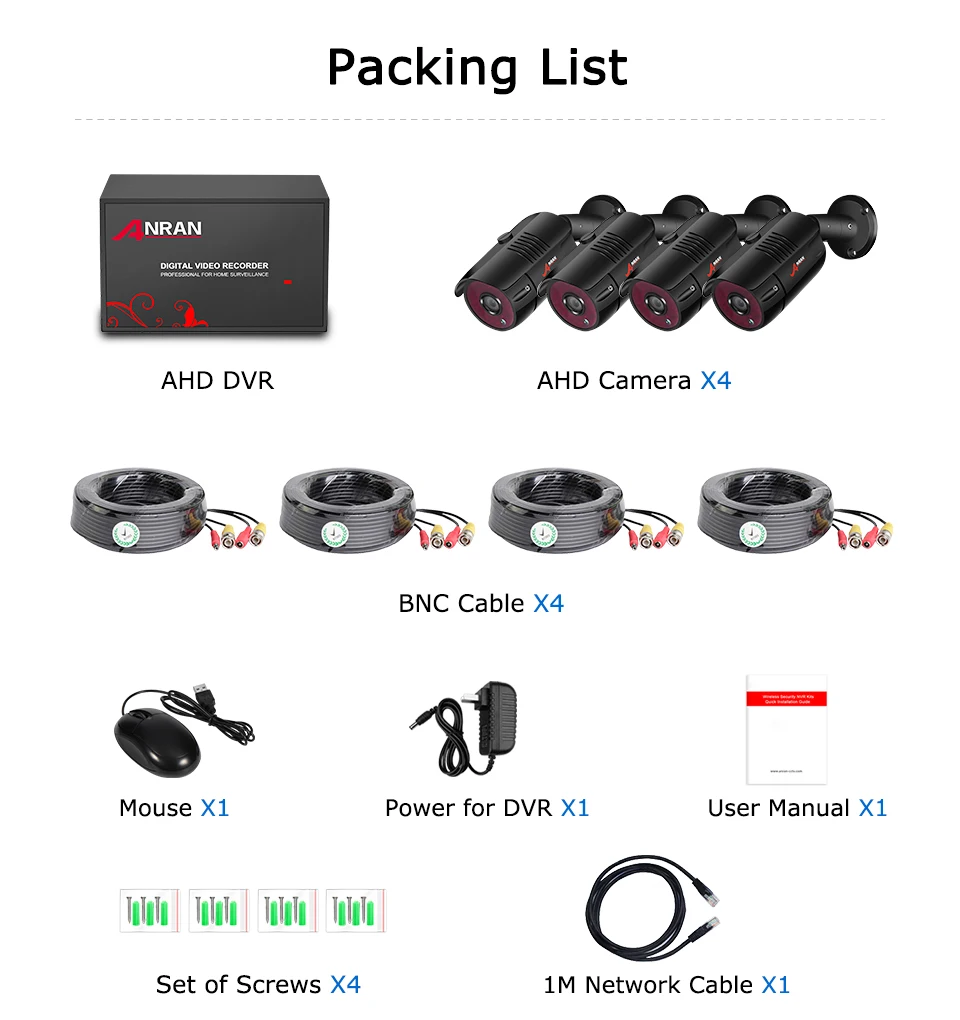 We offer 18 meters BNC video power cable for camera, to make sure you have enough length for installation.If you need a longer BNC cable, please go to our store to buy a 30m or 50m BNC video power cable. The application of AHD 1080P technology makes a higher resolution which improve the image of the replay more delicate.For protecting the things that matter most, having a security camera with 1080p HD resolution is vital. With HD clarity and sharpness, you won't have to worry about missing crucial details if an incident happens to occur on your property. Newly designed, the NVR integrates the power module and powers the camera directly through the BNC cable. Securing your loved ones and property is a 24-hour operation. Fortunately, this Anran wire-free security camera has you covered day and night thanks to their infrared night vision capabilities. Around the camera's lens are 36 powerful infrared LED's that capture high-quality video at night up to 95 feet away. The cameras also feature an automatic infrared cut filter that will automatically disengage at night. This ensures accurate color representation during the day and high-quality black and white infrared video through the night. When movement is detected in monitoring area, instant email will be sent to your mailbox automatically. Get everything informed even you’re away from home.No matter where you are, this security camera will be a reliable protector for your home and let you be assured. You can playback to any specific moment of your recording, Afraid to miss the important monitoring screen,you want to recall the precious memories of the screen, Never let those time slip away. Whenever it is or where you are, as long as you can connect the Internet,you can watch the real time image of your home, support smart phone, ipad,Laptop,PC Multiple usages for Market,Parking,Office, Home etc. Anran will help to set up safety family, business and life! IP66 Weather proof metal casing ensure our camera provides stable performance even under the bad weather. Video System: NTSC / PALOperation System: Linux BasedVideo Input: 4-Channel InputVideo Output: VGA/HDMIDisplay Resolution: NTSC: 1080P/ PAL: 1080PRecord Resolution: 1080N/720P/ 960HRecord Mode: Continuous /Time Schedule /Motion DetectionNetwork Function: Support Live View with PC & Mobile PhoneNetwork Interface: RJ45, 10M/100MNet Protocol: TCP/IP, PPPoE, DHCP and SMTPHDD Interface: Support Maximum 4TB SATA HDD(not included)USB: USB Backup/USB 2.0Power Supply: DC12V We provide EU / US/ UK/ AU Plug ,By default, it is sent by your country.If there are special circumstances, please contact us. 1 x 4CH 1080P Digital Video Recorder 2/4 x 1080P/720P Analog HD Camera2/4 x 18m(60ft) Power Video Plug and Play BNC Cable2/4 x Mounting Screws1 x 12V Power Supply for DVR1 x Mouse for DVR 1 x English user guide 1.The goods will be sent within 7 days once your payment has been verified.2.We do not accept PO BOX addresses, and only ship to confirmed order addresses, your order address must match your shipping address, ordered item and shipping address can’t be changed after item shipped.3.We reserve the right to determine the best shipping method and carrier available.4.SERVICE TRANSIT TIME is provided by the carrier and excludes weekends and holidays. transit times may vary, particularly during the holiday season.5.Shipment from China might come with additional Custom Fees, VAT, Brokerage Fees, Taxes & Remote Area Fees, please to learn about your country's custom policies, ANRAN is not responsible for those charges.6.If the products are detained by customs after the shipment has been left the seller's country, the buyer is resonsible for clearance of the items.7.We strive our best to provide you the most reliable, affordable way of shipping service. but sometimes it is highly depended on the shipping courier and local customs. if you do not receive your item on time, please contact us immediately for further assistance.Warranty 1.All merchandise we sell are in good quality and under strict examination before they are shipped out. we will try our best to avoid any quality problem.2.We provide 1 year warranty for all the products, any unit which proves defective during the warranty validation period will be repaired without charge for parts or replaced. the end user is responsible for all freight charges incurred to send the products to our repair center. the warranty does not cover any incidental, accidental or consequential damages arising from the use of.Feedback 1.Your satisfaction and positive feedback is very important to us, please leave positive feedback and 5 stars if you are satisfied with our items and services.2.If you have any problems with our items or service, just feel free to contact us firstly before you left any neutral or negative feedback, communication is much more efficiently than opening a dispute.