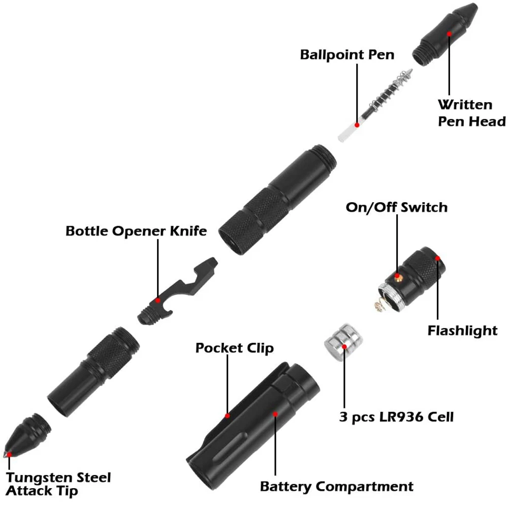 Flashlight + pen core + multi-function tool + window breaker + battery *3