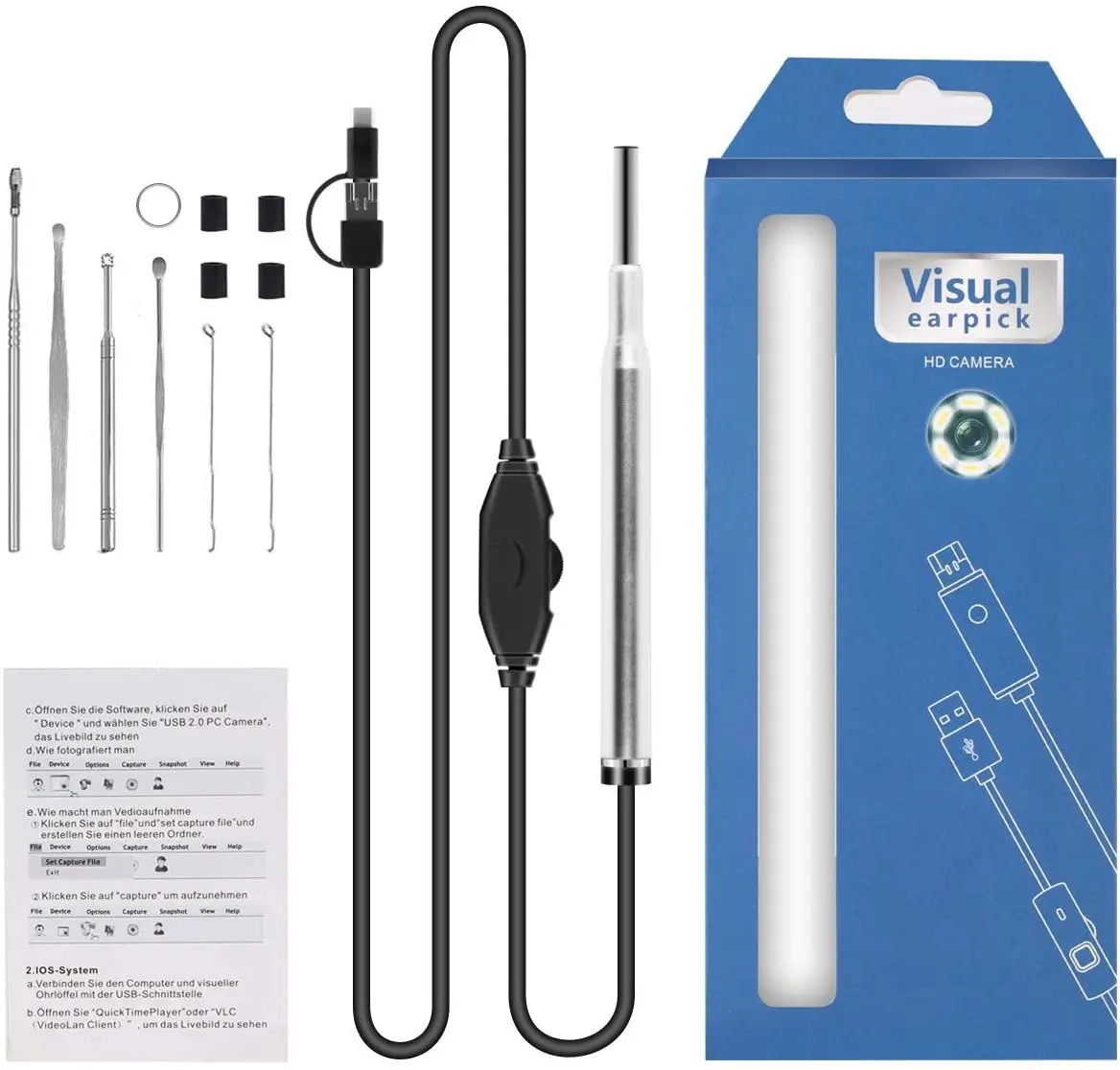 1 ear cleaning endoscope 1 x user manual 1 set of ear cleaning toolsMake sure that your cellphone support OTG and YUV,or it may not be suitable for your cellphone. It can work on all PC(Windows or Mac OS system).