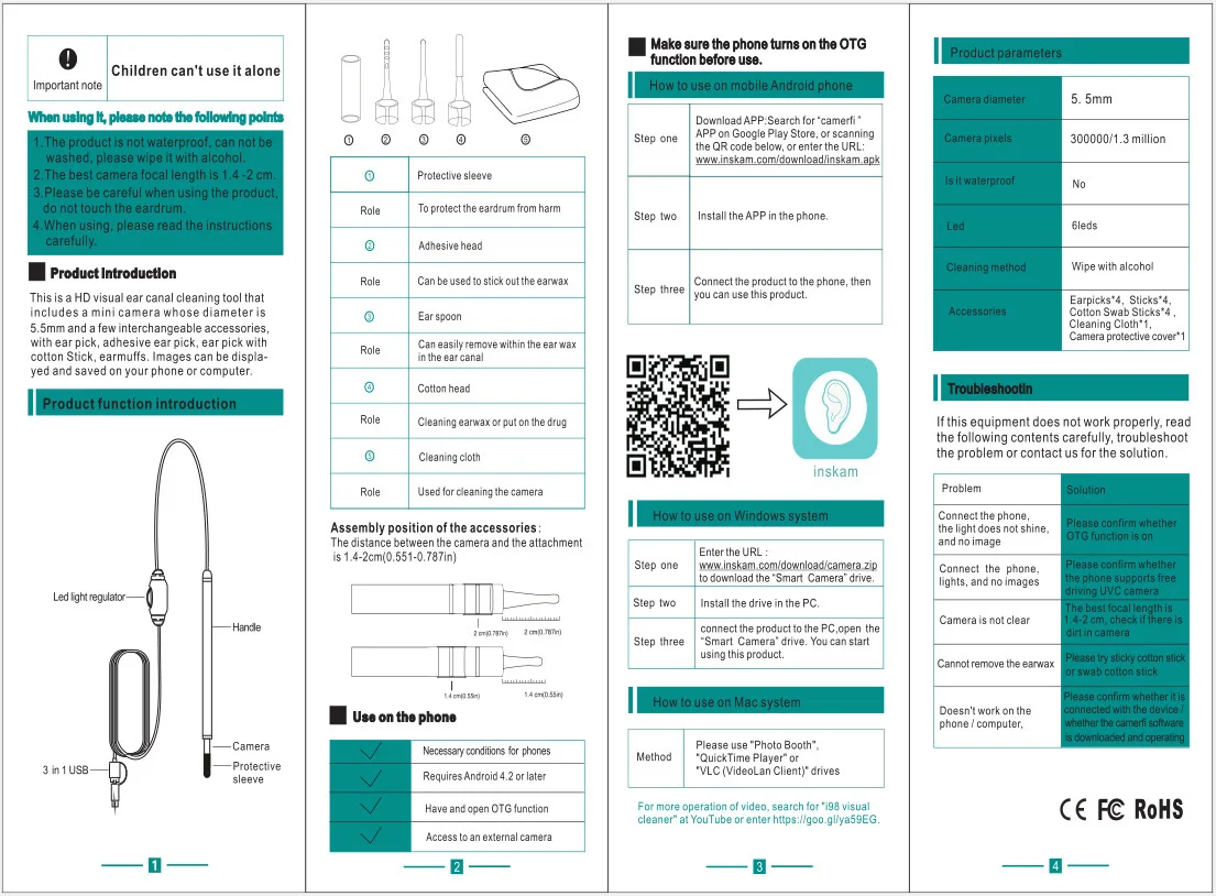 1.Please make sure your phone can support OTG functionality and also compatible with the UVC ( USB video device class) before you buy it .because some of the phone can shielded external camera . (most of recently version of android device have this function,if you not sure it can suit ,please confirm it first before you buy it ) 2. The medical endoscope is a near focal length product, when take picture too close or too far can be very vague, the best focal length is about : 1.5 cm .The farther away from the observation, the lower the clarity of the image. 3.if you have any problem please contact us first. 4.This one need download app, if you worry about it you can choose the one otoscope which include screen. First check your phone whether to open the OTG switch, and Scan the QR code on the Manual to install APP ,click on the icon, if connected to your phone without the image, you can only use the phone model In the following listing or use on a computer, thank you for your understandingPlease carefully check the above information and your phone before ordering, or we'll not be responsible due to the reasons above.why choose our 3.9 mm 3-in-1 Ear Cleaning Endoscope Camera ?