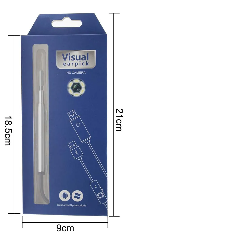 Color: gold , sliver , blue Material: plastic, metal Lens: 3.9mm Light Sources: 6 pcs LED lights, brightness adjustable Best Focal Distance: 1.4 - 2cm Resolution: 1.3MP Resolution: 1280 x 720 pixels Interface: USB 2.0 & Micro USB & USB Type-C Operation System: Android 4.2 or above, Windows 7/8/10, Mac OSX 10.6 or later Software Functions: Taking photos, recording videos, measurement, text input Otoscope 3.9mm Package list