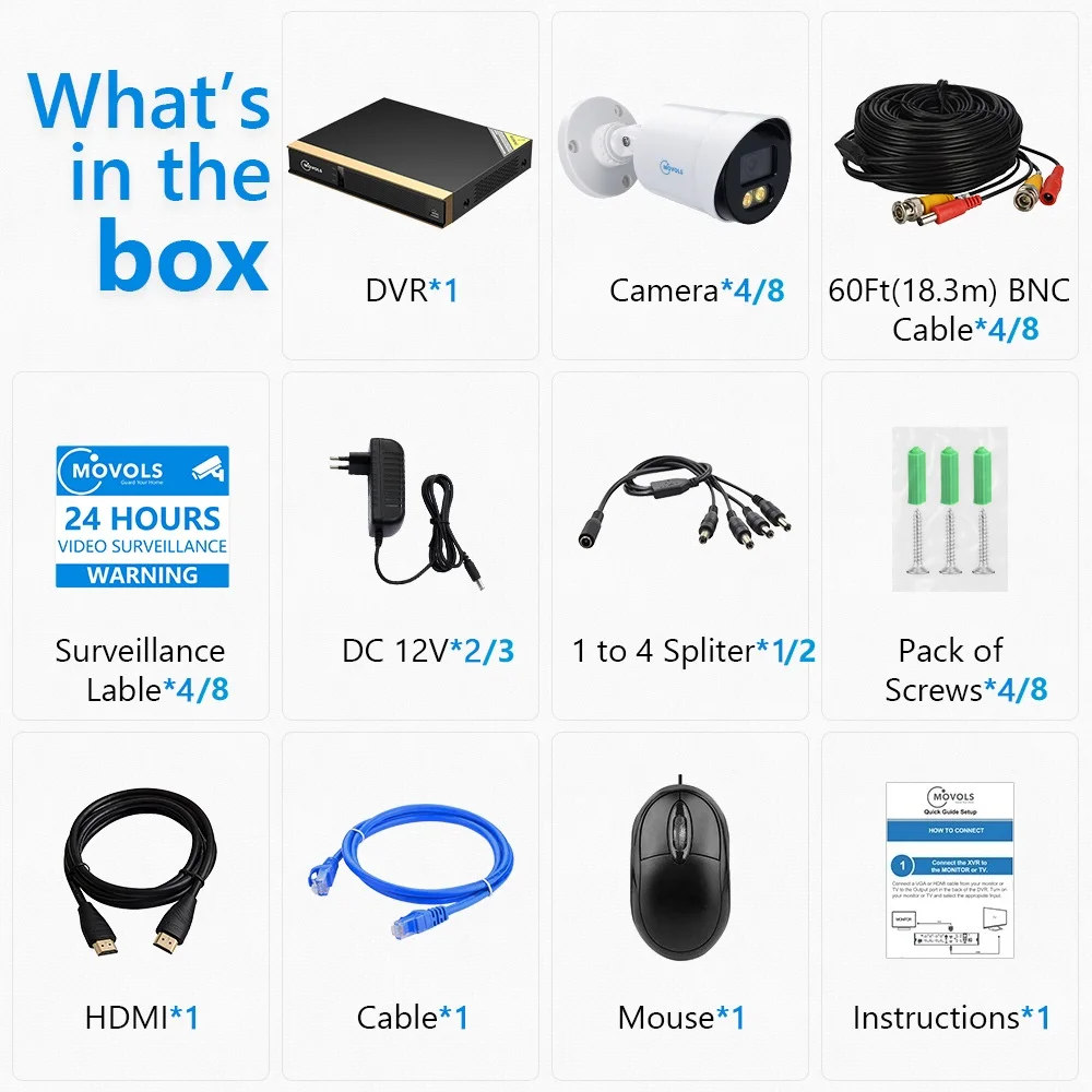 | Movols 2MP AI Colorful Night Vision CCTV Kit H.265+ Waterproof Video Surveillance System 8CH DVR 8PCS/4PCS Security Camera Set |