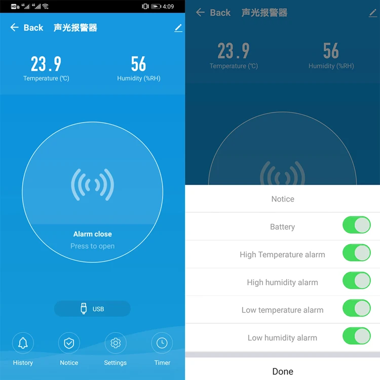 Siren with humidity and temperature sensorTrigger alarm,make sound and light Multiple Sound SelectionPower supply: Mini USB , 5V-1ABackup power supply: CR123A x 2 (optional),not inlcudedSound intensity:105 dBWireless Type:2.4GHz, 1T1RProtocol:IEEE 802.11b/g/n Wireless Range:45mOperating Temperature:0- 40 (32F-104F) Free app:Tuyasmart or Smart Life. Support systems: Android and IOS. Workes with Alexa Echo and google home. Product size(D*W*H): 68x 68x 30mm