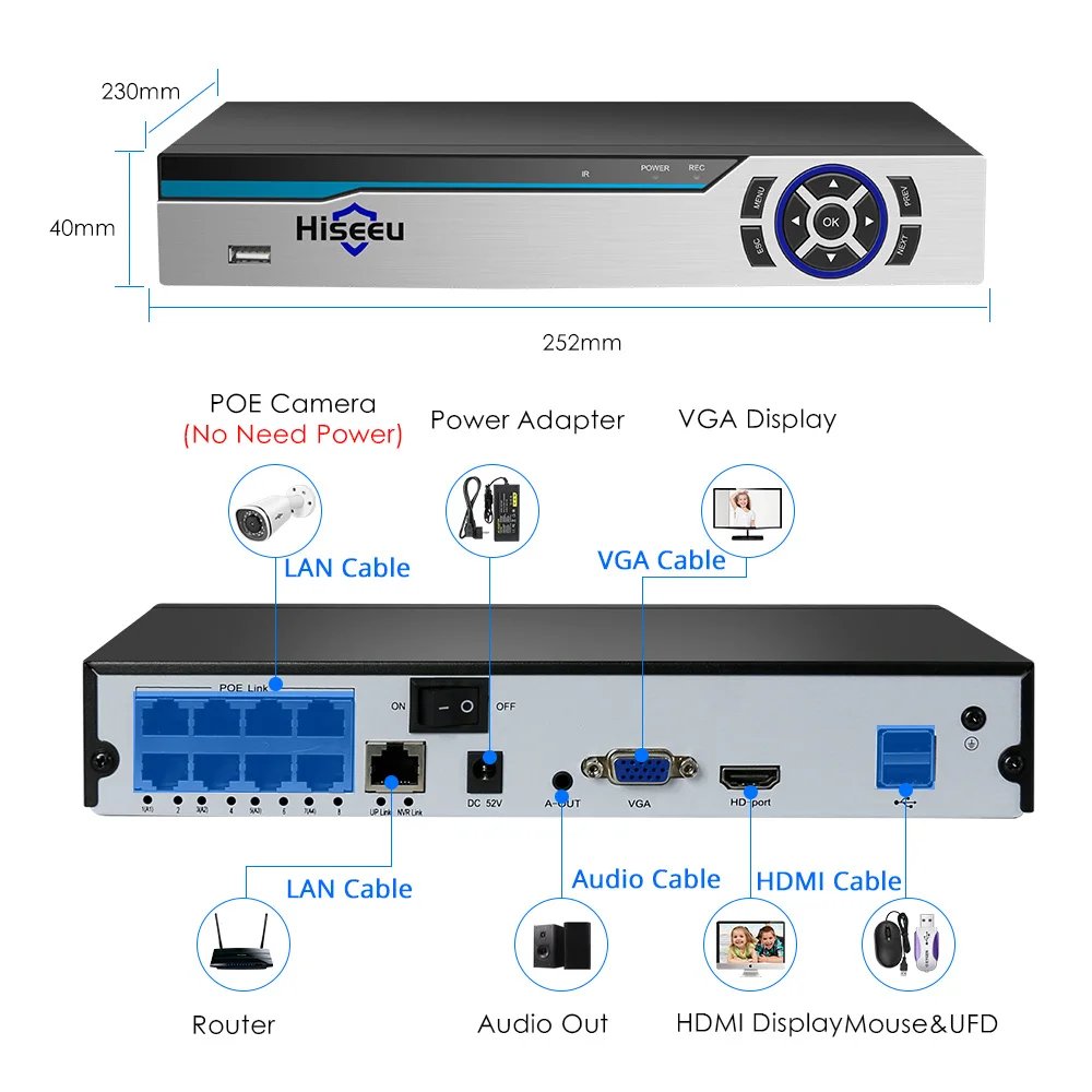 Hiseeu 4K 8CH POE NVR ONVIF H.265 3.5mm Audio Out Surveillance Security Video Recorder for POE IP Camera (1080P/4MP/5MP/8MP/4K)